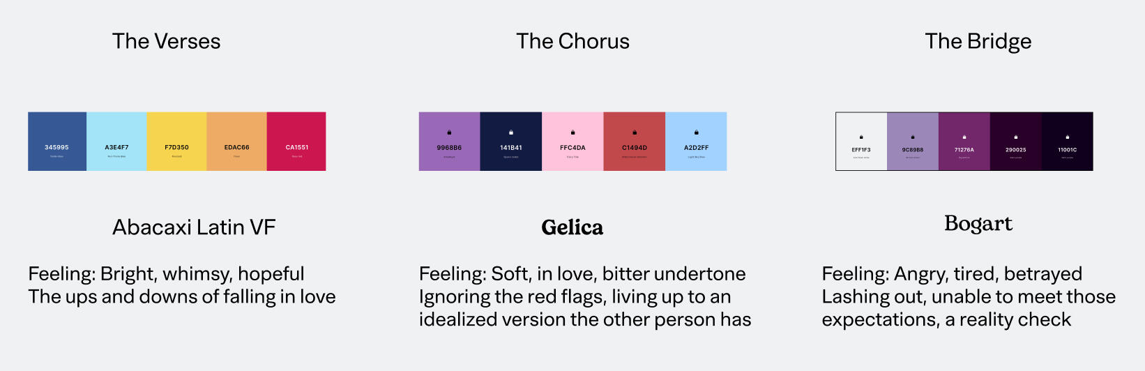 The beginning of the song is more hopeful as the singer talks about the beginning stages of the relationship, so the color scheme is bright and paired with a simple sans serif to match. The chorus is cheerful with melancholy undertones as the singer starts to gloss over the more undesirable aspects of the relationship popping up, so the color scheme used has a couple darker hues paired with Valentine’s Day-inspired colors and a more expressive serif typeface. The bridge is chalked full of emotion as the narrator sings about the hardest aspects of the relationship, so the palette is dark and bold and paired with a variable weight serif font to reflect this change of emotion.