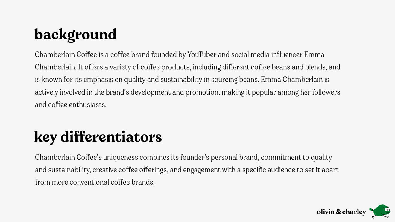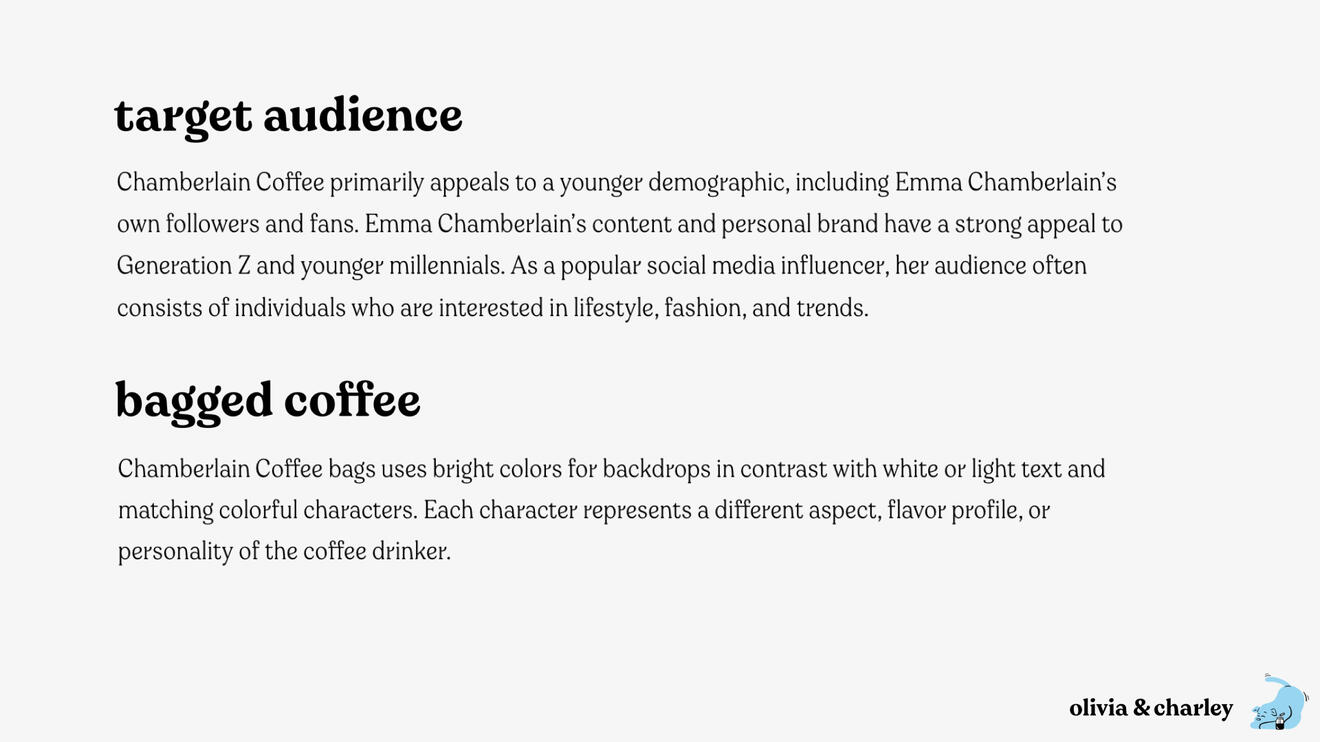 Chamberlain Coffee currently offers coffee beans and a couple of RTD (ready to drink) iced lattes. With more and more people on the go, and higher out-of-home coffee consumption, Chamberlain Coffee is looking to expand and connect with consumers in the on-the-go context by launching a new line of single-serve RTD iced coffee offerings.