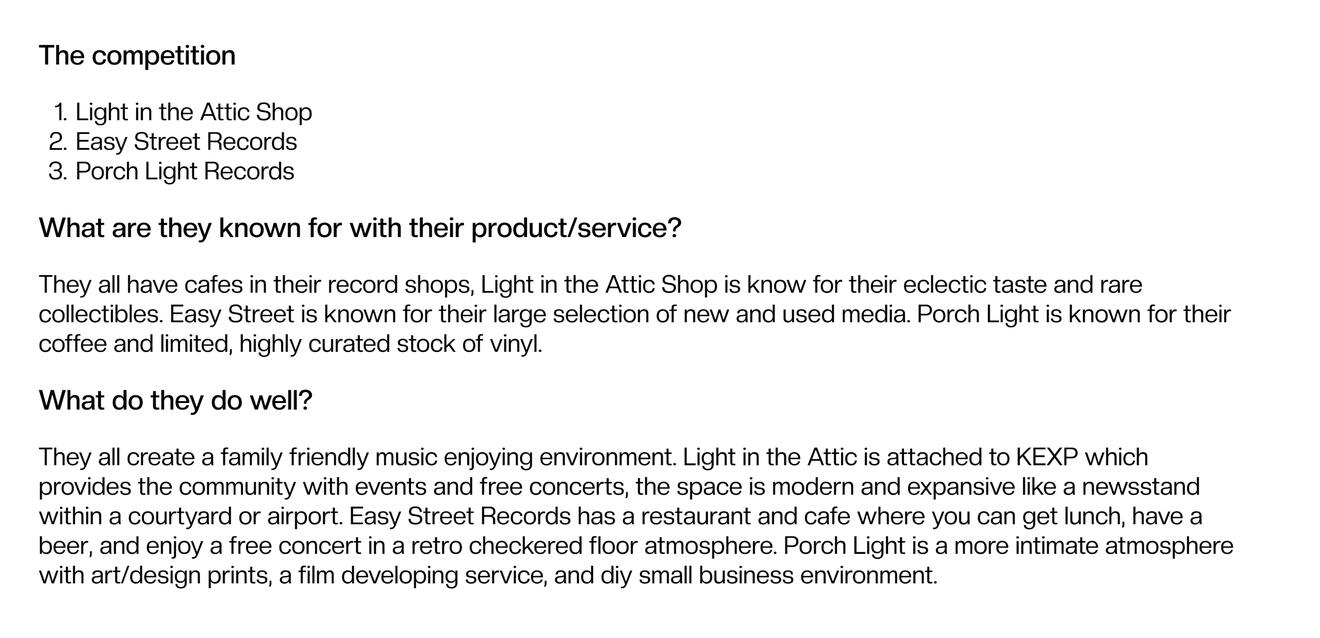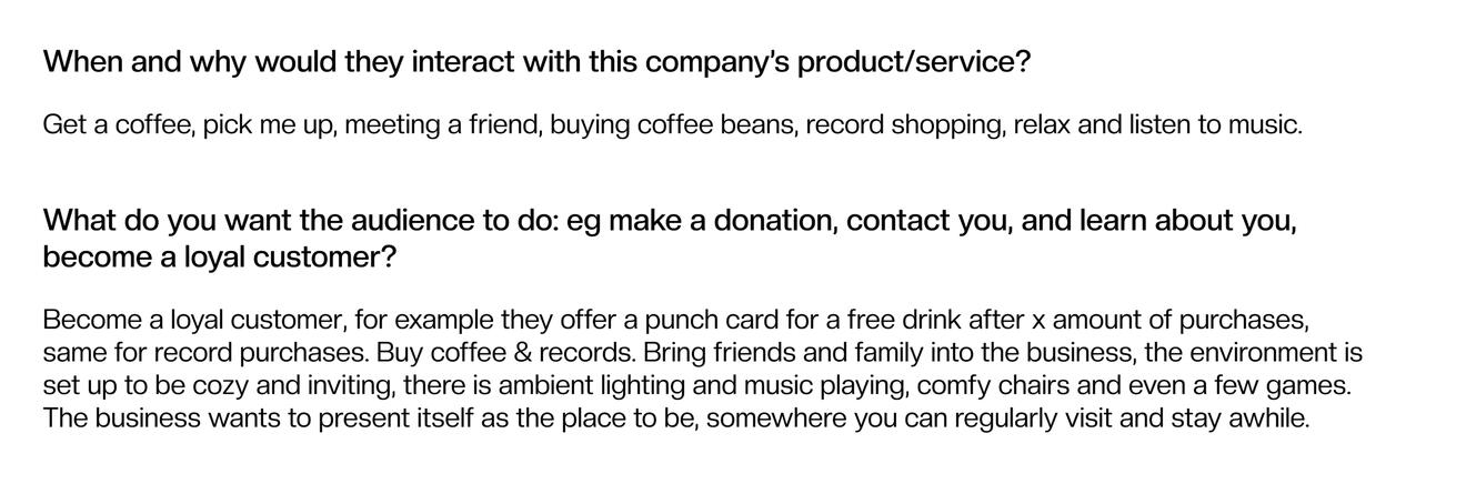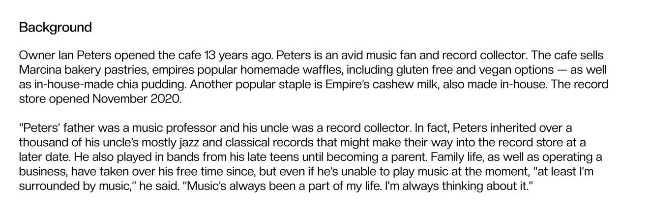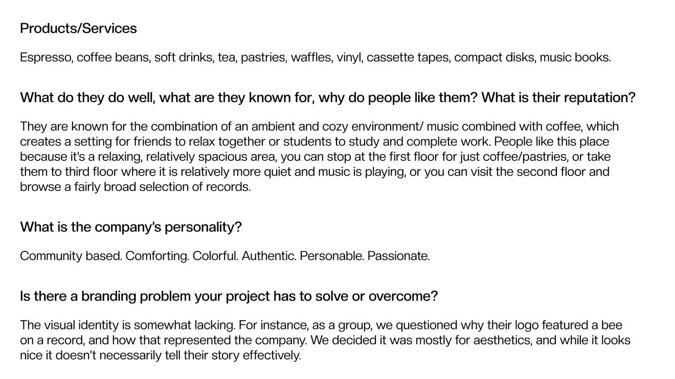 We visited Empire and took notes of both the physical space and the people within it. The two halves of the identity are coffee and records, which have a similarity of both coffee beans and vinyl records being round. This shared characteristic helped inform the creation of the logo and visual tone for the rest of the brand.